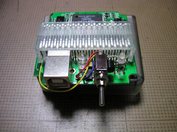 Xchanger」のように、ACアダプタを用意する必要がありません。 また、この改造はレベル2の改造を施してあり手前のスイッチによりGB <-> GBAを切り替えます。GBのときはカートリッジ電圧が高いため、そこにGBAのカートリッジを挿すことは危険です。ですから左図のように青色発光ダイオードを使用して一目で警告を促すようにしております。警告なら赤色の方が良かったかもしれませんが… |