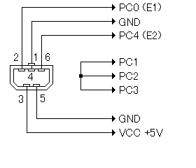 Nintendo64用コントローラ延長ケーブルを用いた配線図を示します。すべてのポートはプルアップ(10Kオームの抵抗を介してVCC+5Vに接続すること)を行ってください。PC0