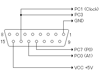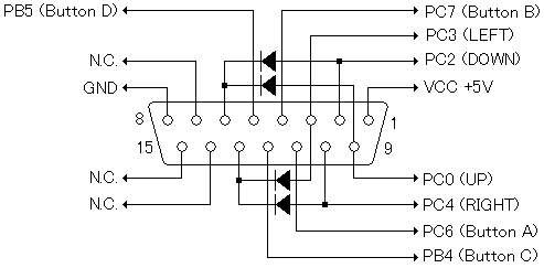 D-SUB15ピン・オスコネクタを用いた配線図を示します。すべてのポートはプルアップ(10Kオームの抵抗を介してVCC+5Vに接続すること)を行ってください。