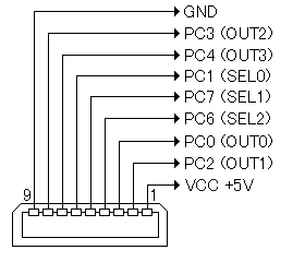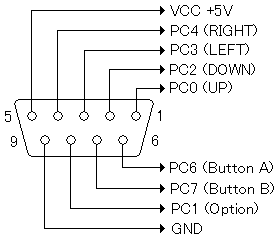 D-SUB9ピン・オスコネクタを用いた配線図を示します。すべてのポートはプルアップ(10Kオームの抵抗を介してVCC+5Vに接続すること)を行ってください。