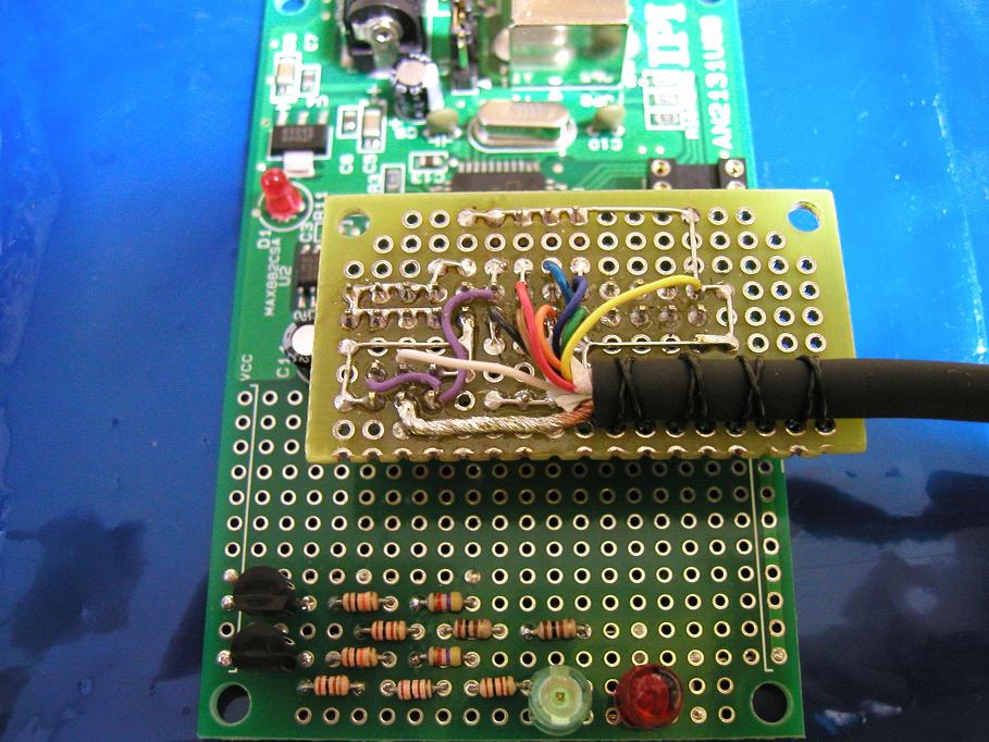 上図のコネクタをIPIの基板に接続し、裏面の写真です。D-SUB9ピン・オスコネクタ及びケーブルは、私の場合それぞれを自作で接続しましたが、全結線タイプのシリアル延長ケーブルを使うと製作が楽になると思います。 |