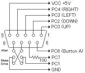 セガサターン用コントローラ延長ケーブルを用いた配線図を示します。すべてのポートはプルアップ(10Kオームの抵抗を介してVCC+5Vに接続すること)を行ってください。 ゲームコントローラ側のコネクタを覗き込んだ図になっています。本体側ではありません。 また、「D-SUB9PのGeneric」を作製することにより「ATR-USB」の変換ケーブルを使用することができます(GenericのPC1は配線してください)。 |