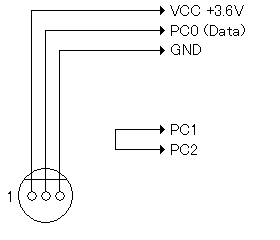 NGC(ゲームキューブ)用コントローラ延長ケーブルを用いた配線図を示します。すべてのポートはプルアップ(10Kオームの抵抗を介してVCC+5Vに接続すること)を行ってください。PC0