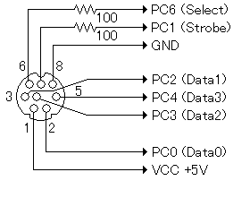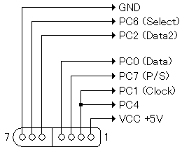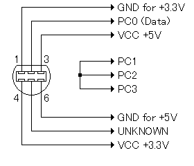 (Data)については、4.7Kオーム程度のプルアップの方が安定します。 VCC +3.3Vは、私の場合はEZ-USBの3.3Vを使用しました。5Vからは、シリコンダイオードを2つ直列に接続することで、約3.3Vを得ることが可能です。 UNKNOWNは不明の端子で、私の場合後の拡張のためにPC7に接続しましたが、現在においては未接続で差し支えありません。 ゲームコントローラ側のコネクタを覗き込んだ図になっています。本体側ではありません。 |