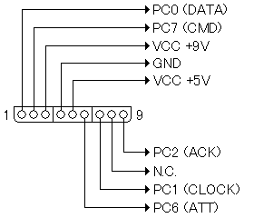 PSX用コントローラ延長ケーブルを用いた配線図を示します。すべてのポートはプルアップ(10Kオームの抵抗を介してVCC+5Vに接続すること)を行ってください。 VCC +9Vは、私の場合は5Vを入力しています。これは振動機能に使いますが、現在のUMJではサポートしていません。配線しなくとも問題はないと思われます。N.C.は何も接続しないという意味です。 ゲームコントローラ側のコネクタを覗き込んだ図になっています。本体側ではありません。 |