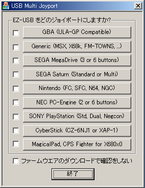 使用許諾契約書 本ソフトウエアは私のEZ-USBに対する理解を深める勉強のため、私の所有するゲーム機のコントローラを有効活用するために実験的に開発しました。趣味で開発していることから、一般的な製品のようなサポートを行うことは不可能です。すべてのリスクは自分で負うことが必要です。 以上のことに同意できる方のみダウンロードし使用することを許可いたします。 |